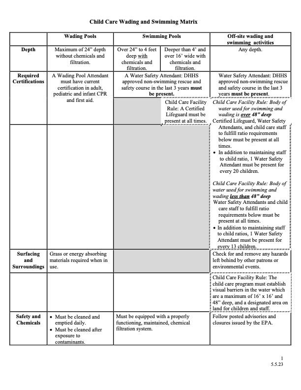 Information covering all swimming/wading activities – sheets provided from Licensing:
