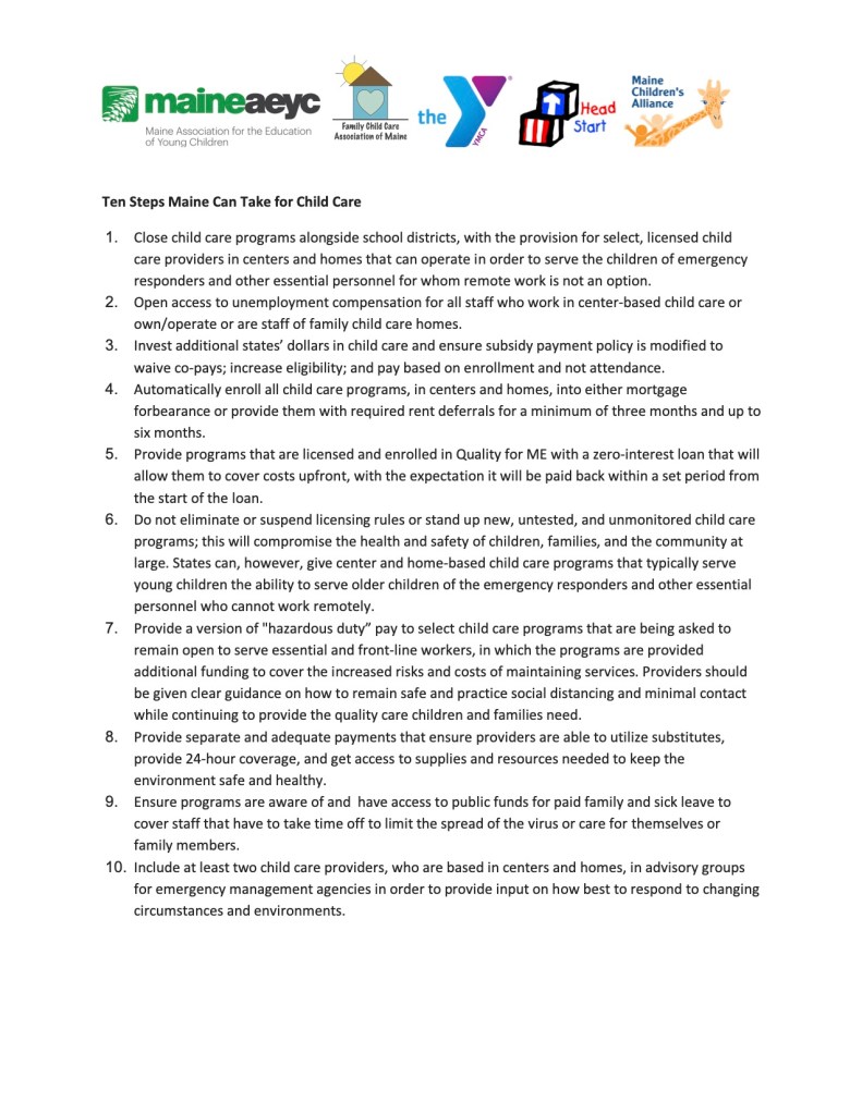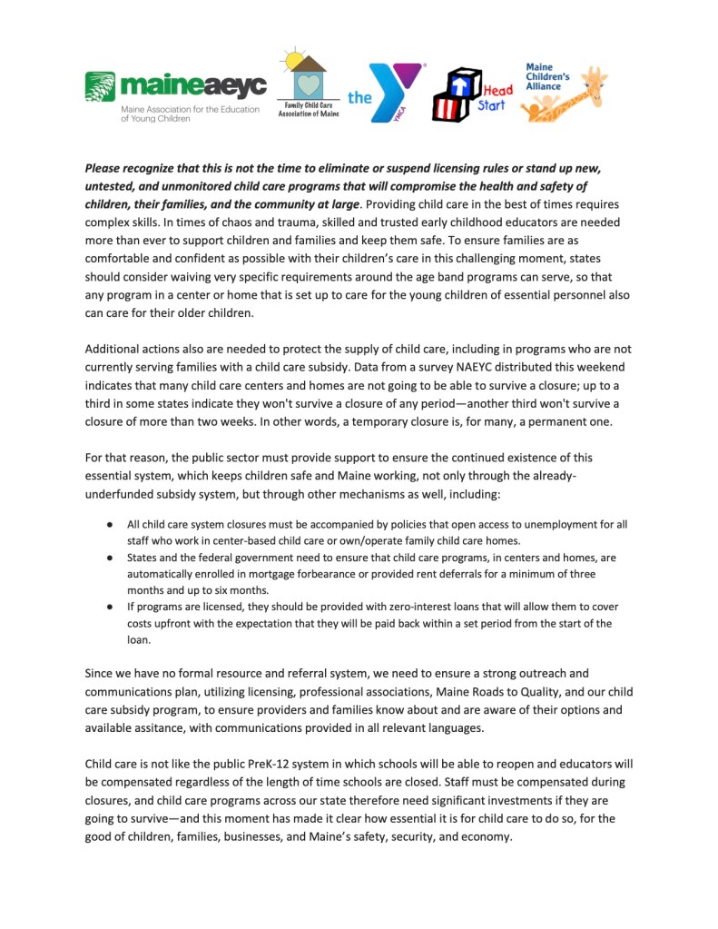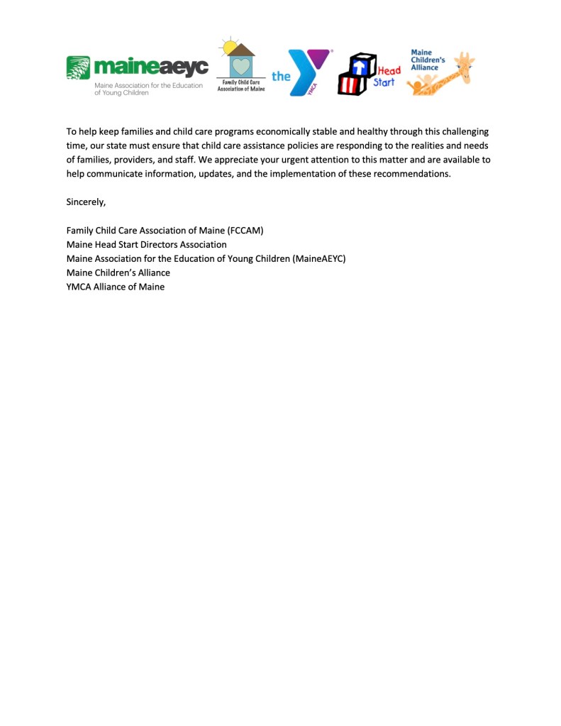 On March 16, MaineAEYC, the Family Child Care Association of Maine, Maine Head Start Directors Association, YMCA Alliance of Maine, and Maine Children’s Alliance sent a joint letter to Governor Mills and Director Todd Landry of the Office of Child and Family Services (OCFS). The letter urging them to allocate the necessary funds for ECE and families to get through the COVID-19 crisis follows here: