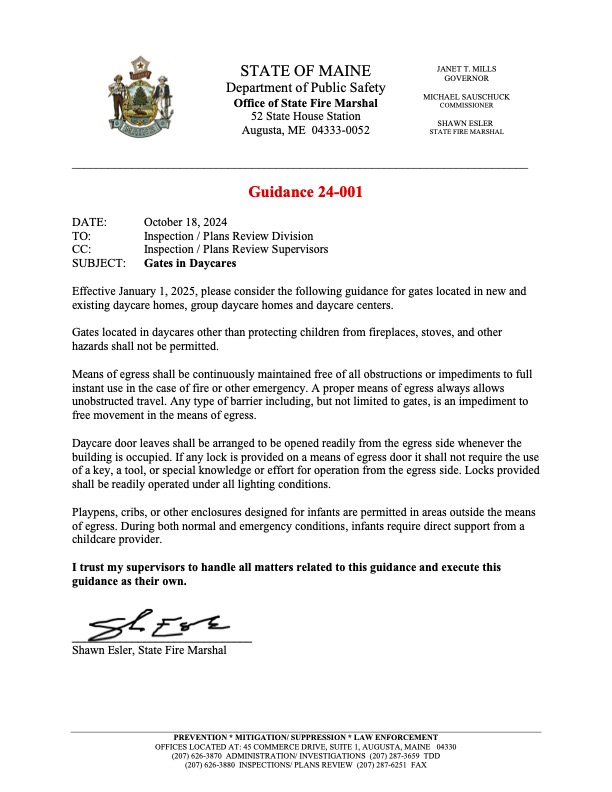 Here’s more information from Office of State Fire Marshal ~ from a November 25, 2024 memo: The Office of the State Fire Marshal recently released internal guidance to its inspectors pertaining to gates and egress in daycares. This guidance was followed up with training and discussions related to this code interpretation. We were made aware this guidance was distributed by DHHS and prompted valid questions from daycare operators which led to this informational packet. We have the utmost respect for our daycare operators and the challenges they face on a regular basis. We are committed to public education, sharing our experience with fire safety, and preventing death and injury from fire or other emergencies. Our daycare providers are stewards of safety, and we look forward to building strong working relationships with one another.