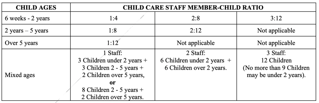 - Children of Child Care Staff Members must be counted in the appropriate age groups and in determining staff-child ratios and capacity when in care at the Child Care Facility.
