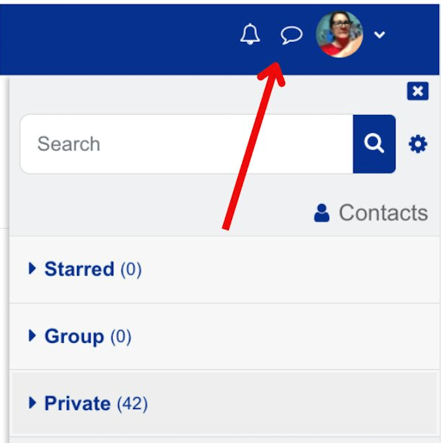 - OR click on the drop down arrow mark next to your profile circle. You will find “messages” in the drop down. Click on it and a larger focused page open where you add the individual’s name in “Search”. Select the correct individual from those provided and an email message box will open up. Type message and click send icon.