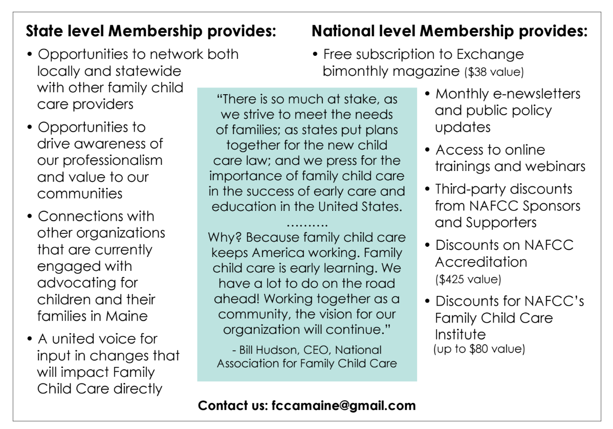 FCCAM works to unify, promote and strengthen quality professional family child care in Maine. We understand the critical role of child care providers in the lives of children and families. Through collaboration with other organizations we work to increase awareness of our profession and the value of a strong child care system to Maine's diverse communities. View All Posts