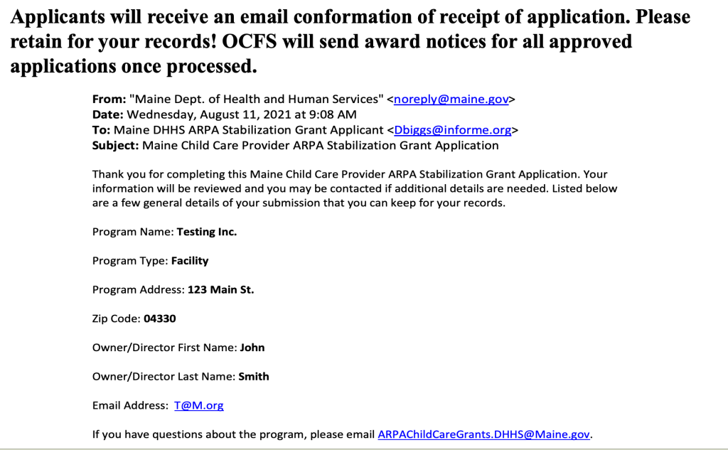 For any provider that stops providing direct care prior to August 1, 2022 you need to notify OCFS ARPA Stabilization Grant administrator of the last day you will be providing direct care. Email: ARPAChildCareGrants.DHHS@maine.gov , or call OCFS at 207-624-7900 or Diane Nicholson directly at 207-624-7996.